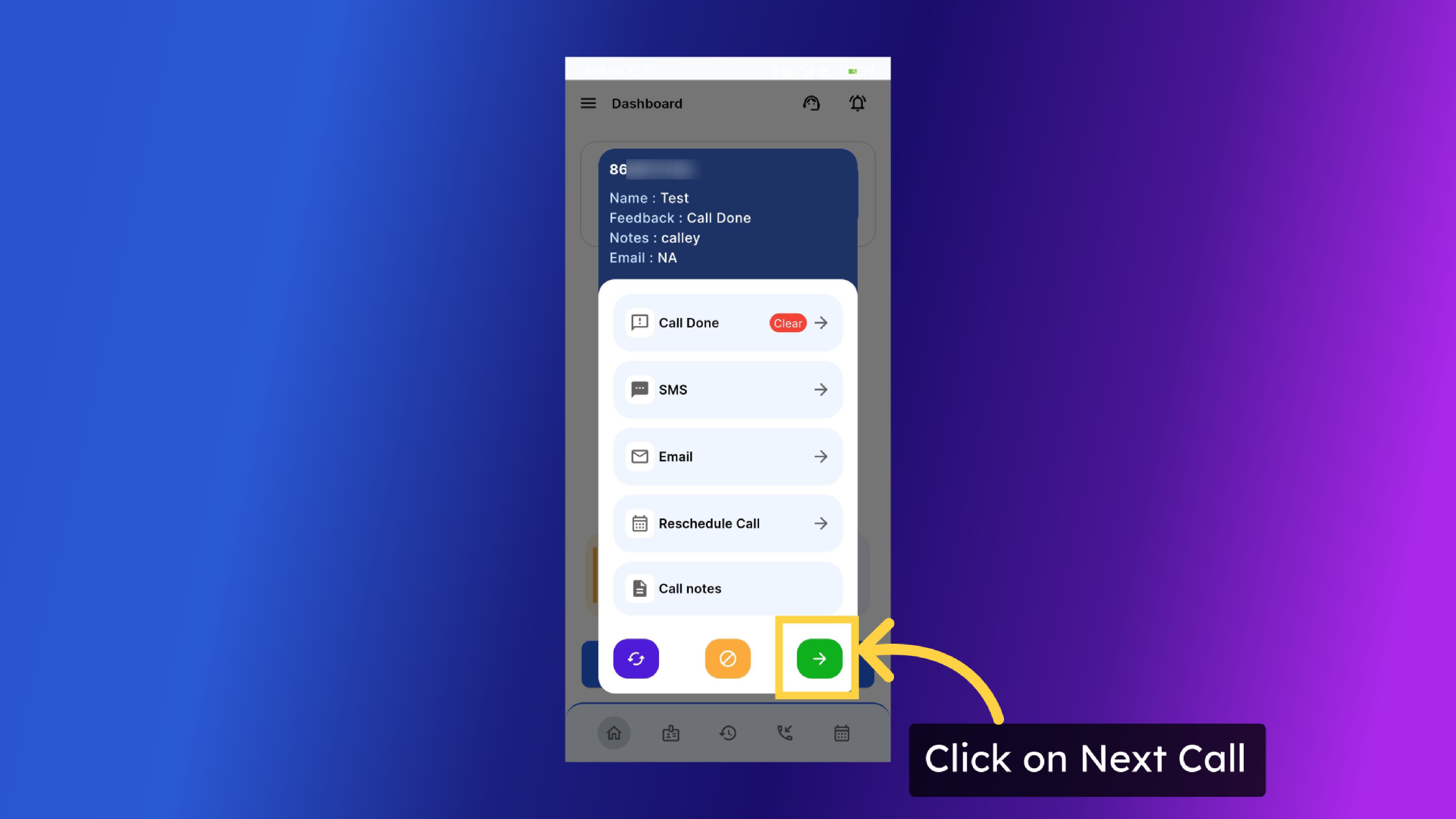 - Once feedback updated, you have 3 options at the bottom of Post Call Feedback screen. One is Redial for Redial same number, DND to mark the number as DND and another is Next Call to dial next number of the List.