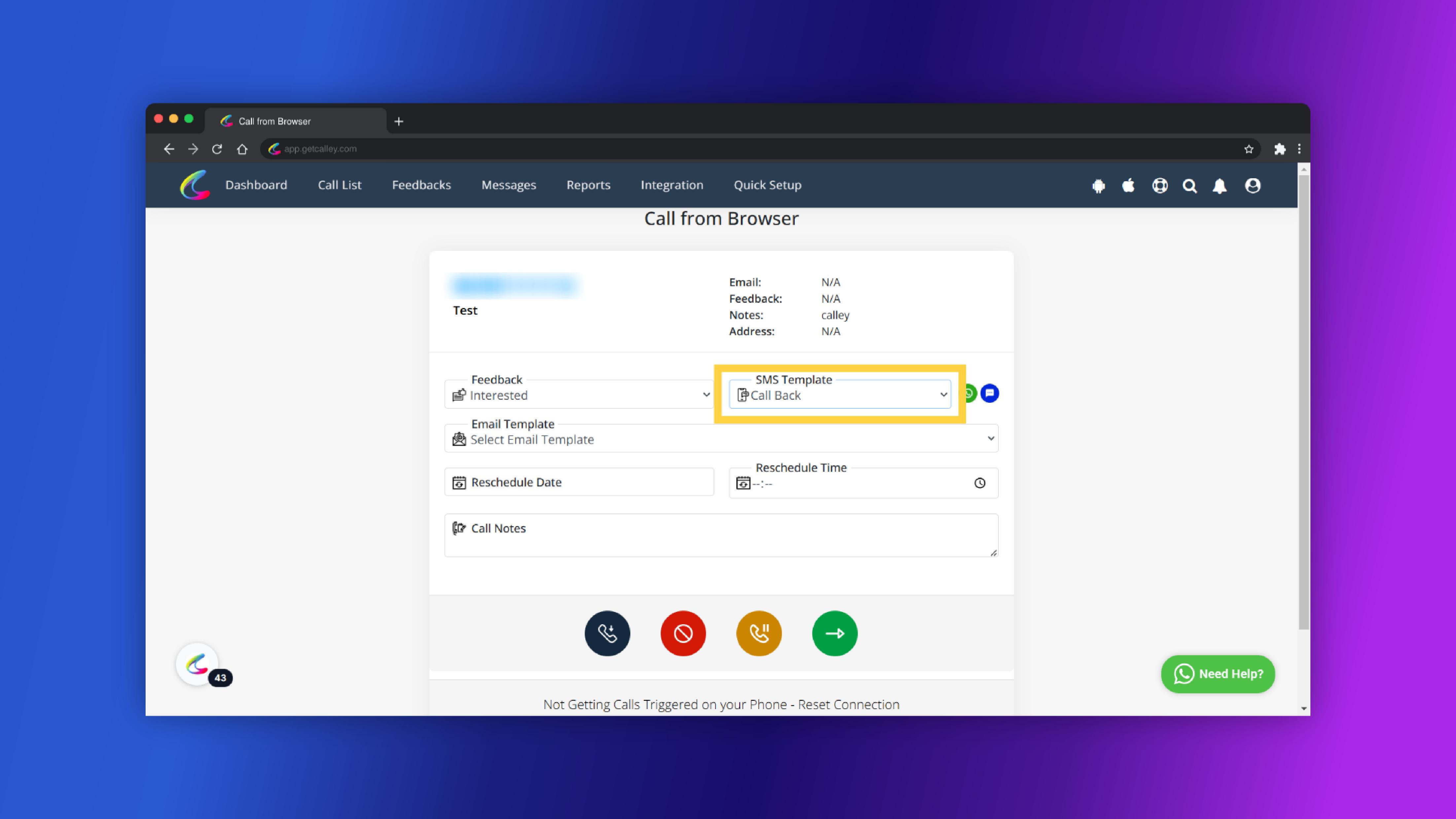 Once done with the Call, Update the Feedback of the Call here and To send the WhatsApp message select the Message Template.